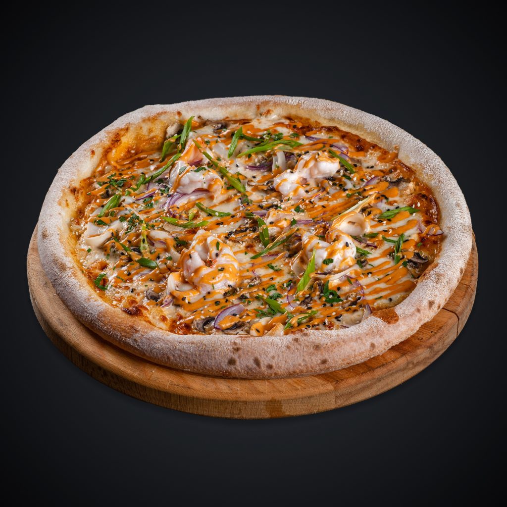 Креветки, бекон, соус «Унаги», кунжут, соус «Сливочный».