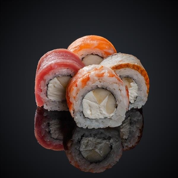 Состав: лосось, тунец, угорь, авокадо, сыр “Cremette”, нори, рис.