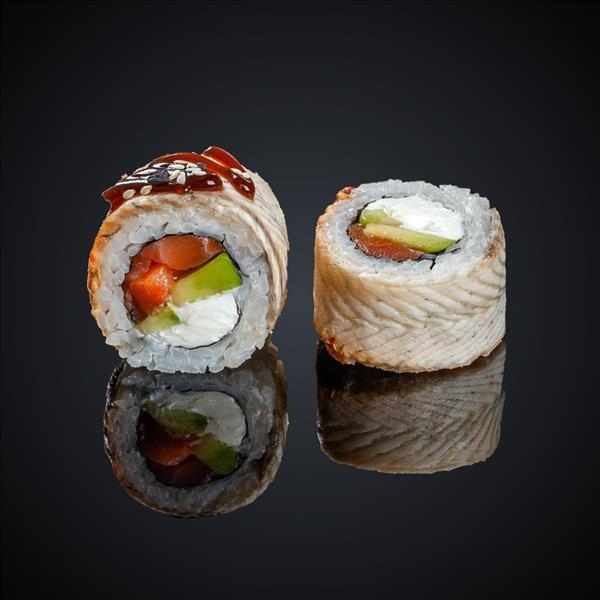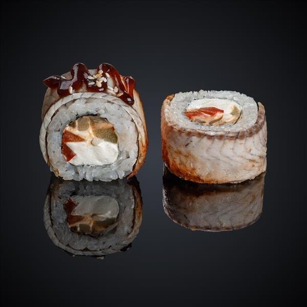 Состав: угорь, лосось копченый, авокадо, сыр “Cremette”, соус “Унаги”, кунжут, нори, рис.