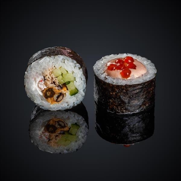 Состав: угорь, лосось, огурец, сыр “Cremette”, соус “Унаги”, нори, рис.