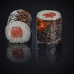 Состав: лосось, огурец, соус “Спайси”, икра “Масаго”, нори, рис.