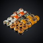 Состав: мидии, снежный краб, огурец, икра красная, соус “Гавайский”, нори, рис.