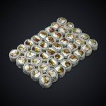 Состав: мидии, снежный краб, огурец, икра красная, соус “Гавайский”, нори, рис.
