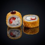 Состав: лосось, авокадо, огурец, майонез, икра “Масаго”, нори, рис.