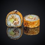 Состав: креветка, авокадо, огурец, майонез, икра “Масаго”, нори, рис.