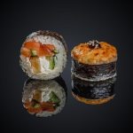 Состав: мидии, снежный краб, огурец, икра красная, соус “Гавайский”, нори, рис.