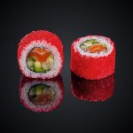 Состав: лосось, огурец, соус “Спайси”, икра “Масаго”, нори, рис.