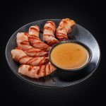 Креветки, бекон, соус «Унаги», кунжут, соус «Сливочный».