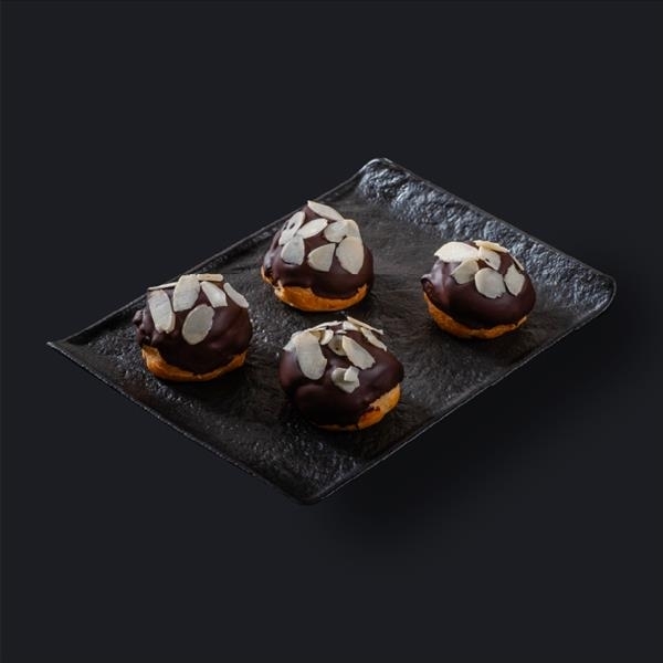 заварное тесто, ванильный крем, глазурь из шоколада, миндальные лепестки