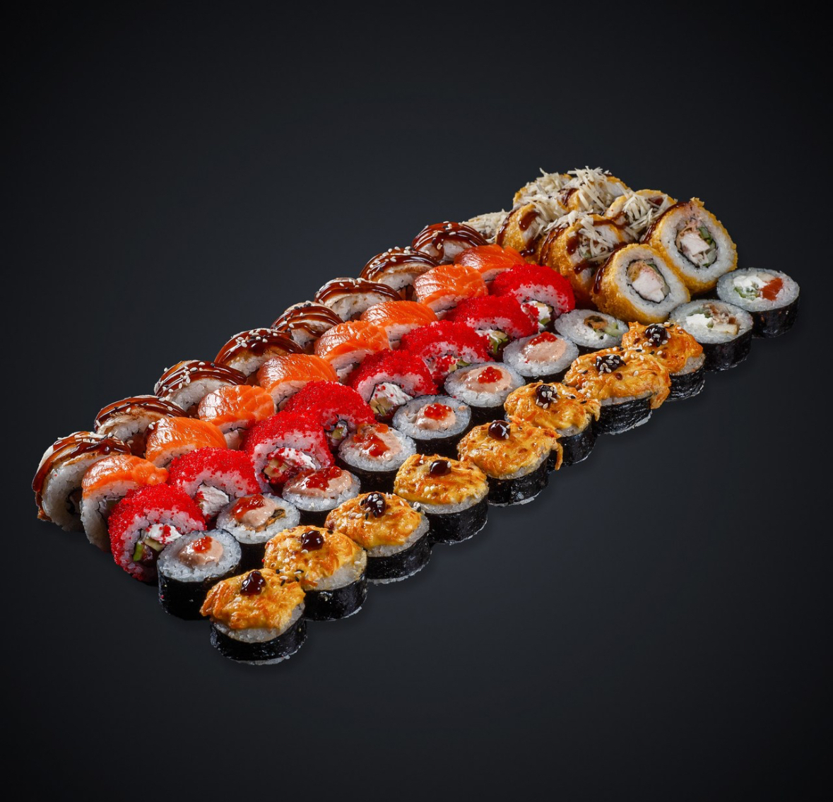 Состав: лосось, угорь, тунец, лосось копченый, креветка, креветка в темпуре, снежный краб, мидии, авокадо, сыр “Cremette”, нори, рис.