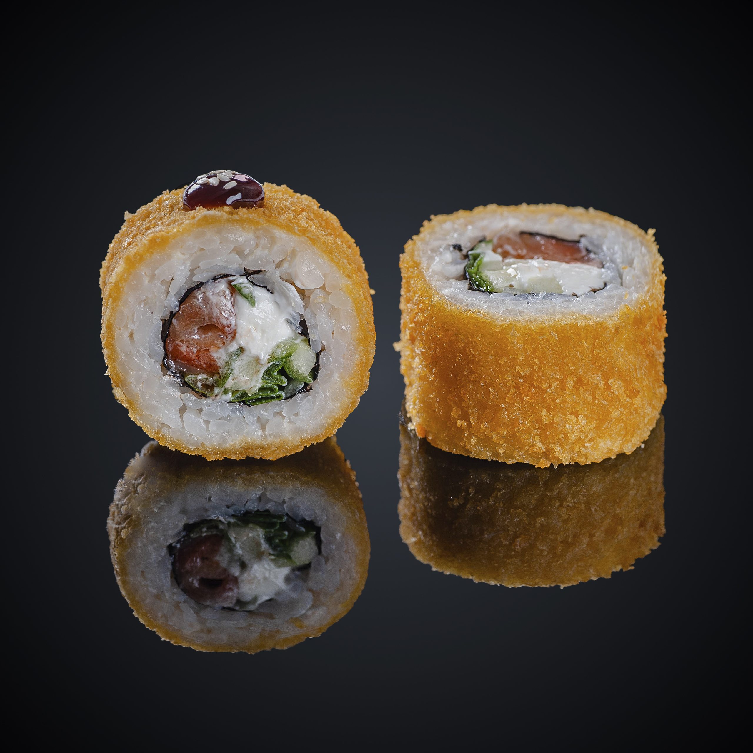 Лосось копченый, огурец, сыр “Cremette”, лук зеленый, соус Унаги, панировочные сухари, кляр, кунжут, нори, рис.