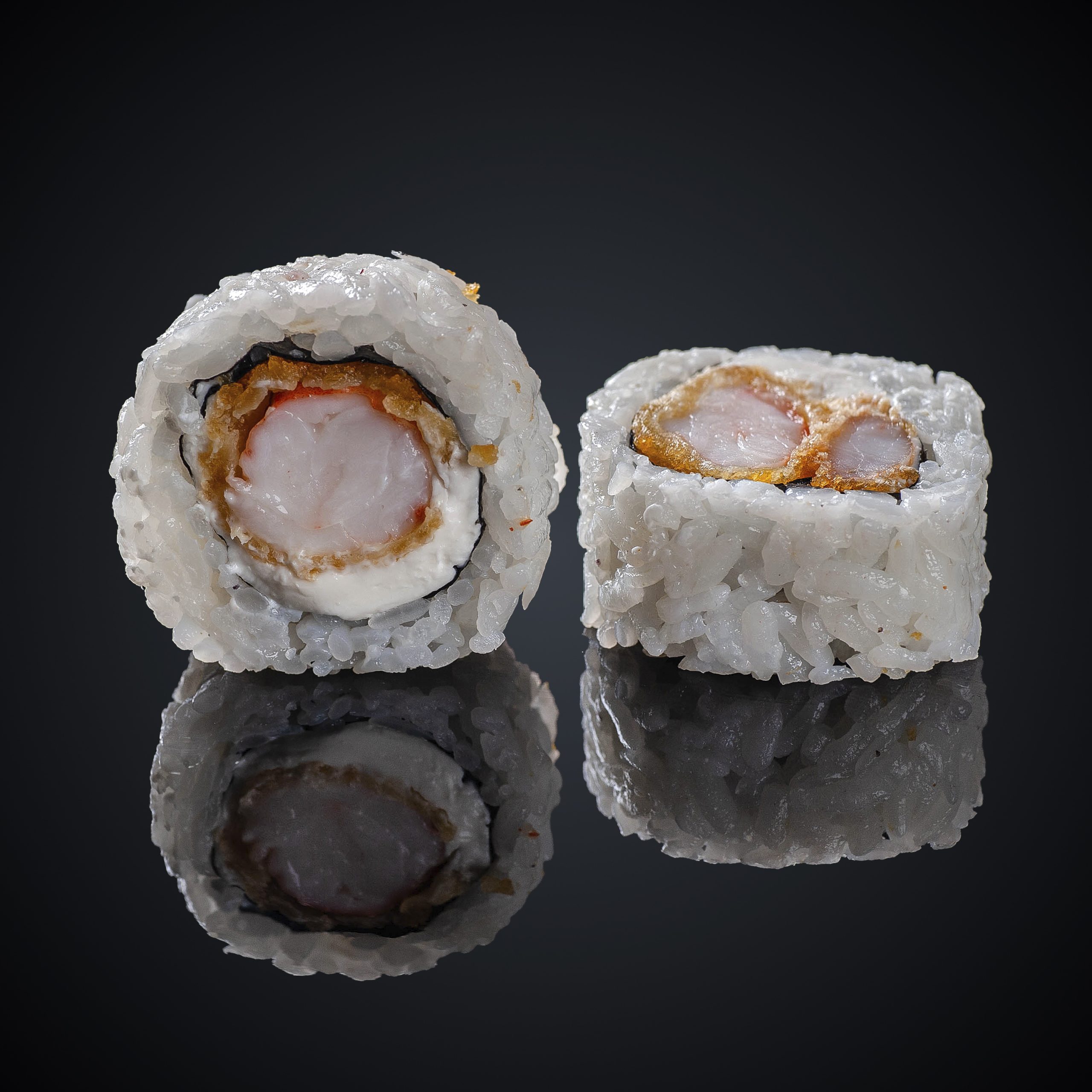 Состав: креветка, авокадо, огурец, майонез, икра “Масаго”, нори, рис.