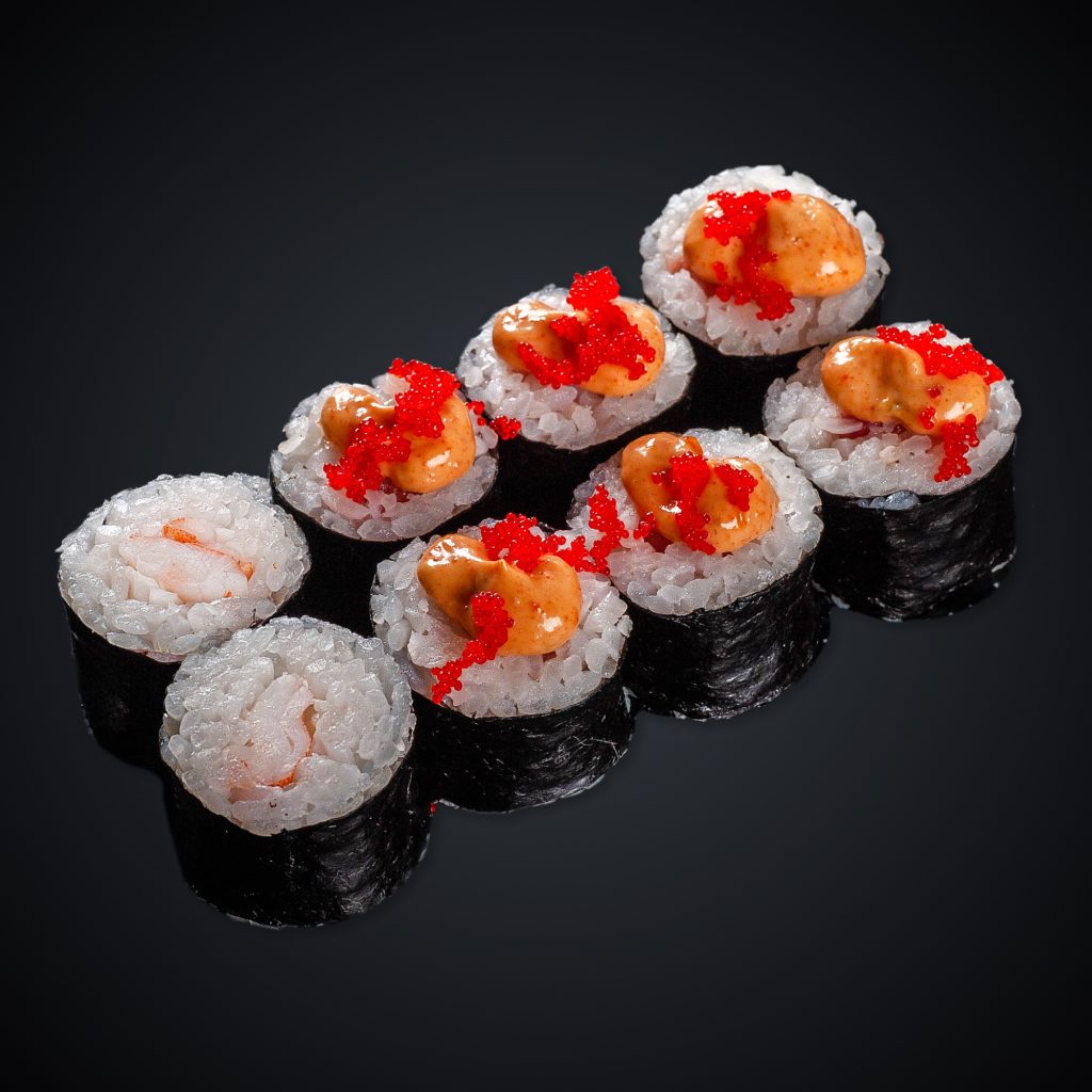 креветеки, соус “Спайси”, икра “Масаго”, нори, рис.
