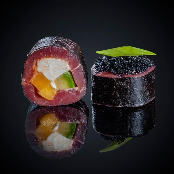 Состав: тунец, сыр «Cremette», авокадо, манго, соус «Спайси», лук зелёный, икра масаго, нори.