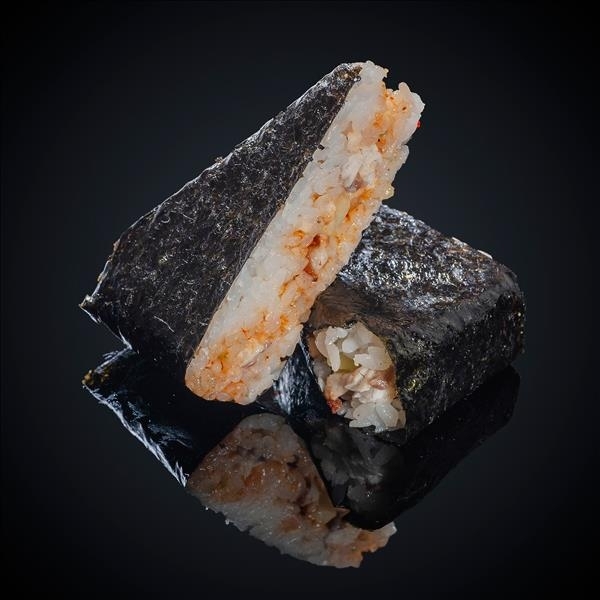 Состав: креветка, «Гавайский» соус, икра масаго, нори, рис. *Изображение носит демонстрационный характер. Онигири подаётся не в разрезанном виде.
