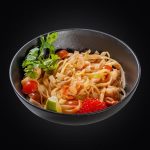 Куриное филе, яйцо куриное, кабачок, перец болгарский, морковь, лук зеленый, «Sweet chili sauce», соевый соус, кунжут, рис.