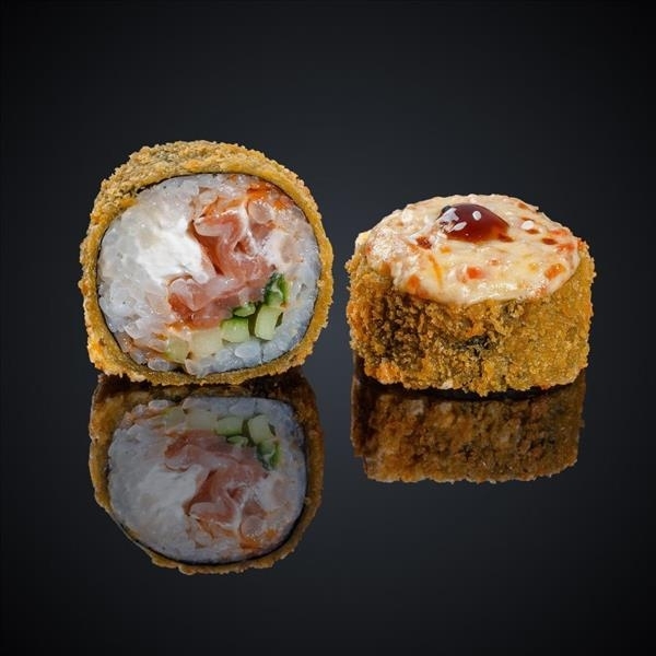 Лосось, сыр “Cremette”, огурец, соус «Секрет», соус Спайси, соус Унаги, кунжут, панировочные сухари, кляр, нори, рис.