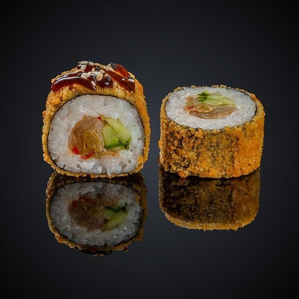 Лосось копченый, огурец, сыр “Cremette”, лук зеленый, соус Унаги, панировочные сухари, кляр, кунжут, нори, рис.