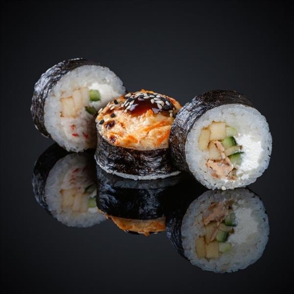 Курица копченая, огурец, сыр “Cremette”, яблоко, соус “Секрет”, соус “Унаги”, кунжут, нори, рис.