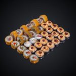 Состав: лосось, угорь, креветка, тунец, сыр «Cremette», манго, огурец, авокадо, икра масаго, соус «Унаги», соус «Спайси», нори, рис.