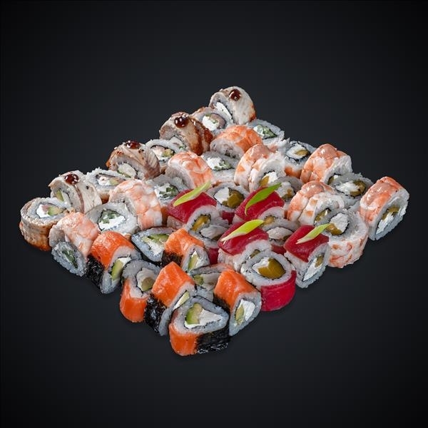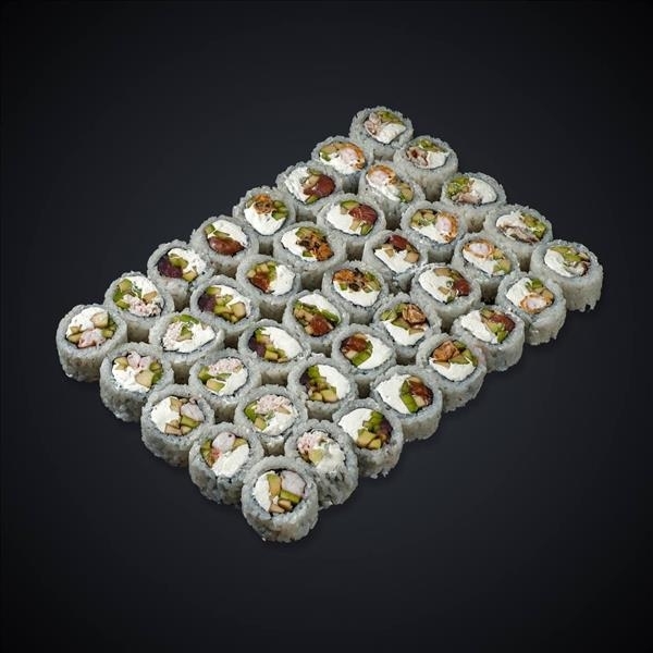 Состав: лосось, угорь, тунец, лосось копченый, креветка, креветка в темпуре, снежный краб, мидии, авокадо, сыр “Cremette”, нори, рис.