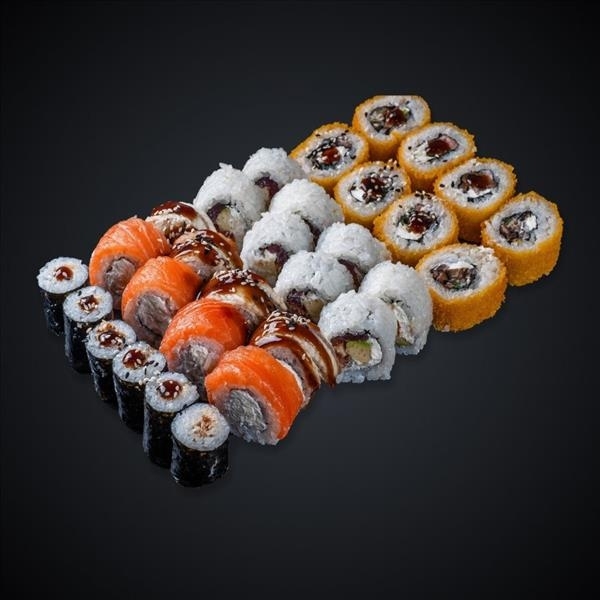 Состав: ролл Праздничный, ролл Филадельфия с креветкой, ролл Филадельфия с авокадо треугольная, ролл Сливочный тунец с манго, ролл Сливочная креветка с манго.