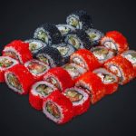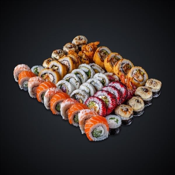 Состав: Лосось, угорь, тунец, креветки темпура, креветки варёные, снежный краб, сыр «Cremette», сыр Моцарелла, авокадо, огурец, салат айсберг, манго, зелёный лук, икра масаго, соус «Гавайский», соус «Спайси», соус «Унаги», кляр, кунжут, нори, рис.