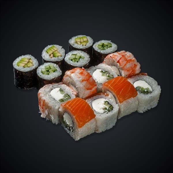 Состав: Филадельфия классик — 1/2, Филадельфия с креветкой — 1/2, Ролл с авокадо — 1/2, Ролл с огурцом — 1/2 .