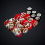 Состав: лосось, угорь, тунец, лосось копченый, креветка, креветка в темпуре, снежный краб, мидии, авокадо, сыр “Cremette”, нори, рис.