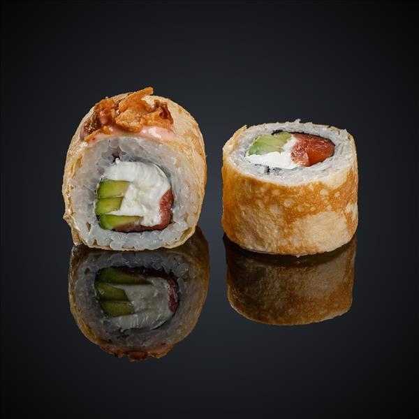 Состав: лосось копченый, тамаго, авокадо, сыр “Cremette”, лук фри, соус “Гавайский”, нори, рис.