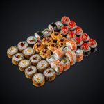 Лосось, авокадо, сыр “Cremette”, сыр “Моцарелла”, соус “Спайси”, соус “Унаги”, кунжут, нори, рис.