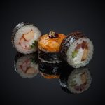 Курица копченая, огурец, сыр “Cremette”, яблоко, соус “Секрет”, соус “Унаги”, кунжут, нори, рис.