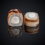 Угорь, лосось, огурец, сыр “Cremette”, яблоко, соус “Секрет”, соус “Унаги”, кунжут, нори, рис.